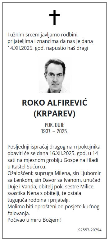 Tužnim srcem javljamo rodbini, prijateljima i znancima da je dana 23.XI.2025. preminula naša voljena MIRA JERKUNICA 1943. – 2025. ud. Lovre