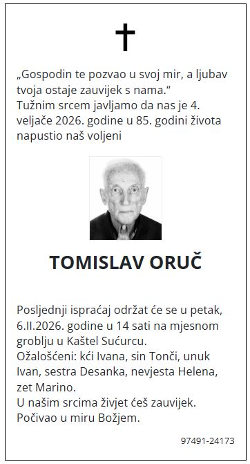 “Gospodin te pozvao u svoj mir, a ljubav tvoja ostaje zauvijek s nama.“ Tužnim srcem javljamo da nas je 4. veljače 2026. godine u 85. godini života napustio naš voljeni