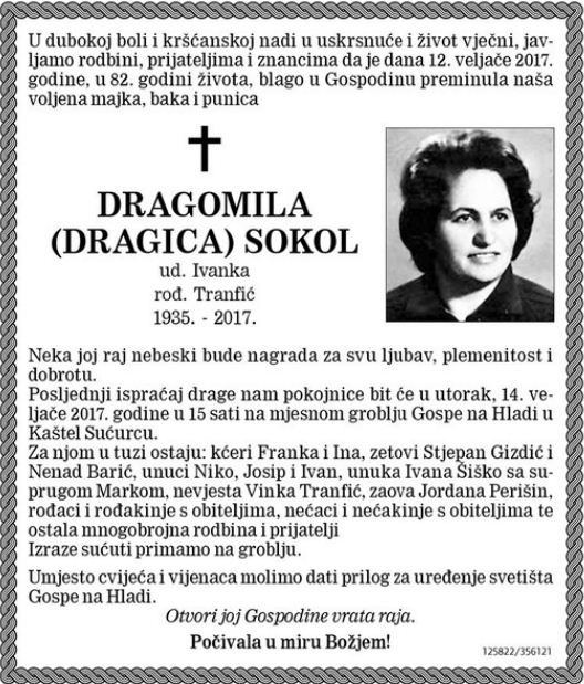 U dubokoj boli i kršćanskoj nadi u uskrsnuće i život vječni, javljamo rodbini, prijateljima i znancima da je dana 12. veljače 2017. godine, u 82. godini života, blago u Gospodinu preminula naša voljenja majka, baka i punica
