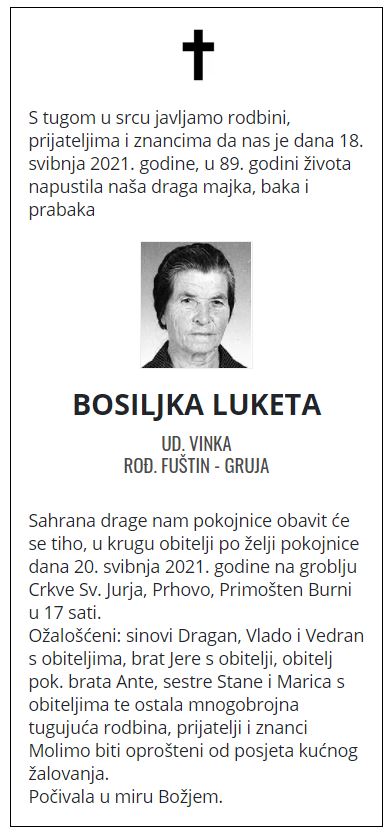 S tugom u srcu javljamo rodbini, prijateljima i znancima da nas je dana 18. svibnja 2021. godine, u 89. godini života napustila naša draga majka, baka i prabaka