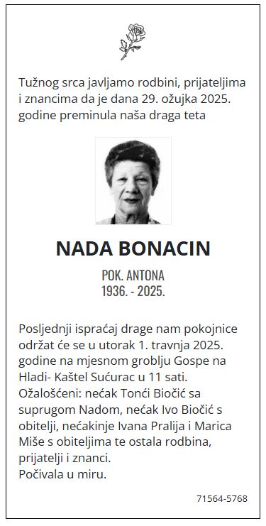 Tužnog srca javljamo rodbini, prijateljima i znancima da je dana 29. ožujka 2025. godine preminula naša