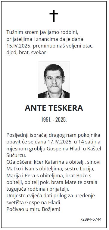 Tužnim srcem javljamo rodbini, prijateljima i znancima da je dana 15.IV.2025. preminuo naš voljeni otac, djed, brat i svekar