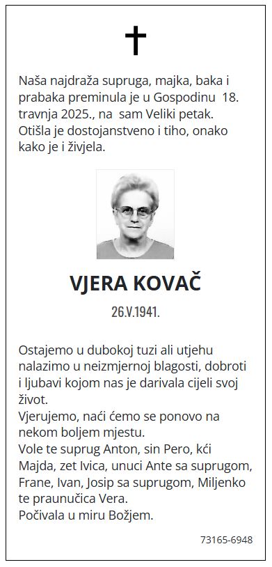 Naša najdraža supruga, majka, baka i prabaka preminula je u Gospodinu  18. travnja 2025., na  sam Veliki petak. Otišla je dostojanstveno i tiho, onako kako je i živjela.