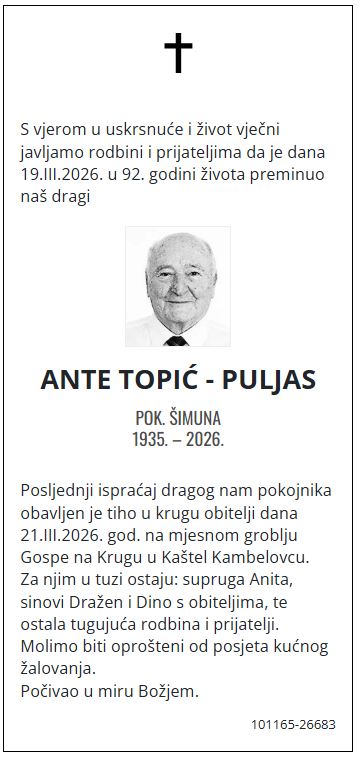 S vjerom u uskrsnuće i život vječni javljamo rodbini i prijateljima da je dana 19.III.2026. u 92. godini života preminuo