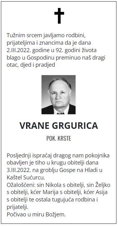 “Ja sam uskrsnuće i život, tko u mene vjeruje ako i umre živjet će.” (Iv. 11,25) S tugom u srcu i vjerom u život vječni javljamo rodbini, prijateljima i znancima da je dana 21.II.2022. god. preminula naša draga MIRJANA VRŽINA ROĐ. SIRIĆ 1959. – 2022.