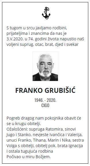Tužnim srcem javljamo rodbini, prijateljima i znancima da nas je dana 22.IV.2020. godine napustio naš dragi suprug, otac, djed i svekar IVAN BRATINČEVIĆ PEČENKOV pok. Šimuna 1947. – 2020.