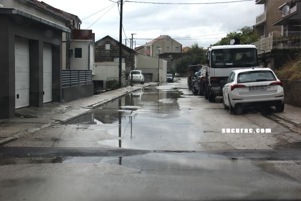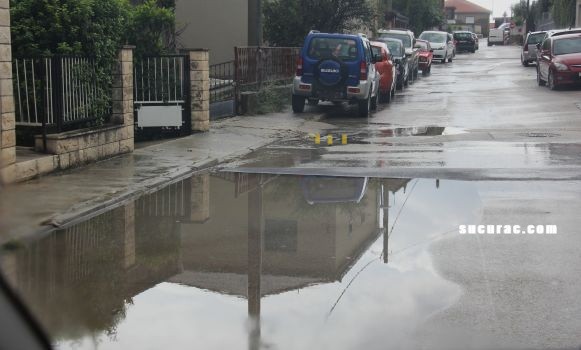 Pa se tako u Jerčićevoj ulici di je prošlu sedmicu meklo ležeče,za koje san napisa,da ji je zbog protoka vodurine oton ulicon kad pada kiša,tribalo raspilat,dogodilo to, da su oti isti ležeči blokirali normalan protok vodurine za vrime i posli kiše,tako da je bilo vrlo blizu tomen,da se,kako su mi rekli oni šta tamo stojidu, voda zamalo počela prilivat priko ceste prema kučaman.Pogledajte slike: